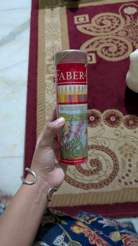 I chose thirty-six colors in the cylindrical tube. It was slightly more expensive, but it seemed practical. I remember my reasoning so clearly: the tube would be easier to carry around in my school bag, easier to store the pencils, and unlike the cardboard box, it wouldn’t break down. As a result, I wouldn’t lose my colored pencils, which was a common issue for me at the time.