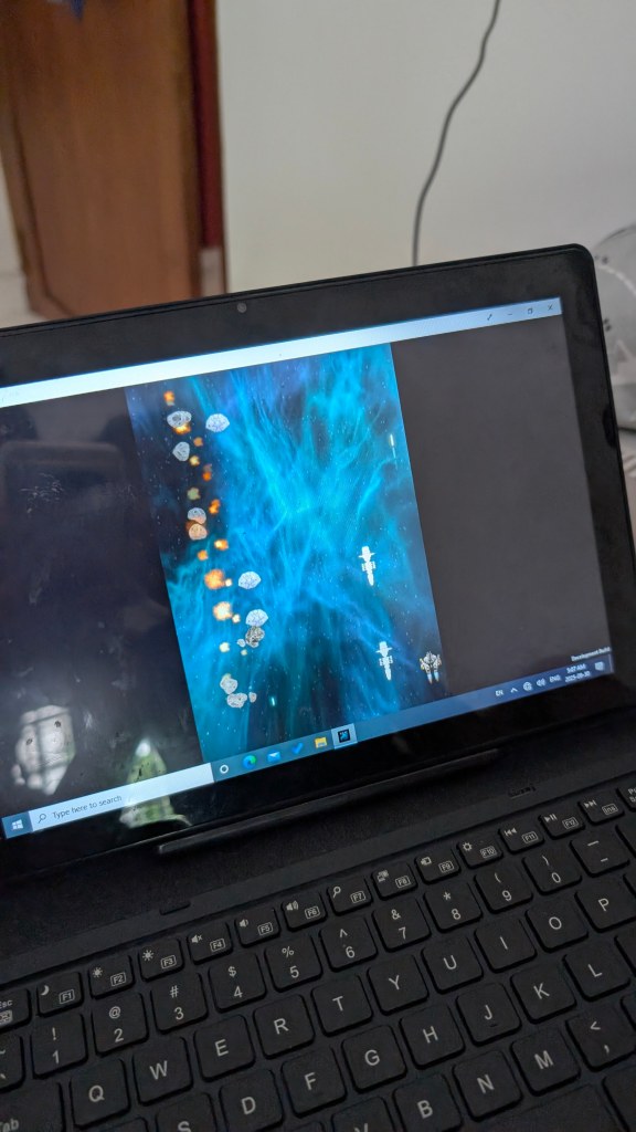 This is a photo of a game on my son’s laptop – spaceship sprites scattered across a blue nebula and asteroids drifting in patterns. My husband and I built this little universe for our son, with the help of AI.